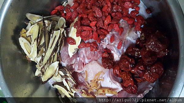 比例就是一鍋湯配半隻雞或一隻雞(看雞的大小跟你的鍋子大小)....蔘鬚一把裡面取兩三根,用自己的手當量器,黃耆抓一把,紅棗抓一把,枸杞抓兩把